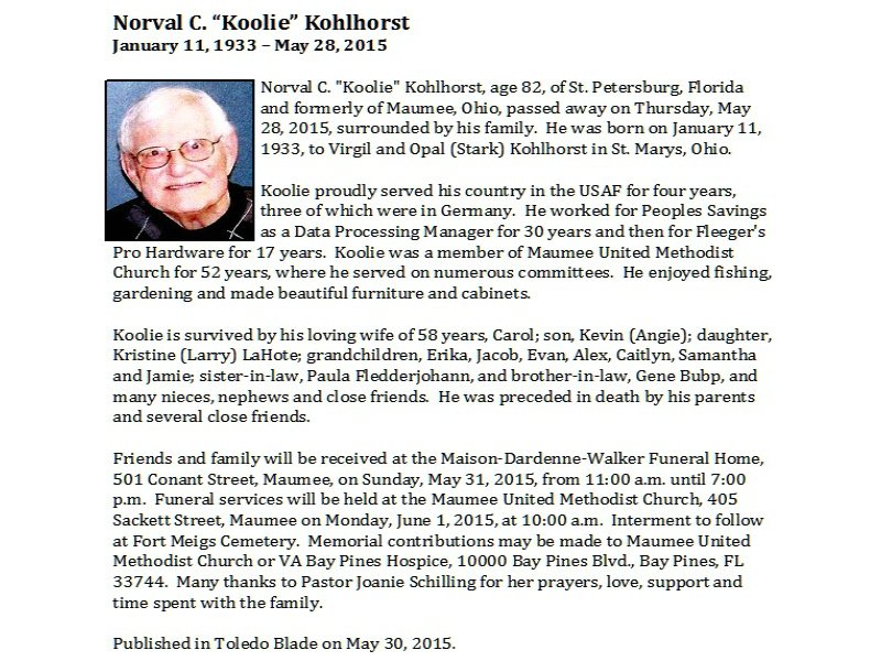 Kohlhorst, Norval, Maison Dardenne Walker Funeral Home, Maumee, OH Published by Toledo Blade; 05/30/2015