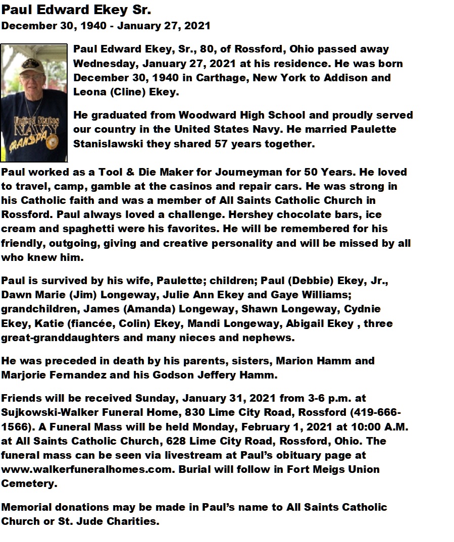 Ekey Sr, Paul - Obituary, Sujkowski-Walker Funeral Home, Rossford, OH