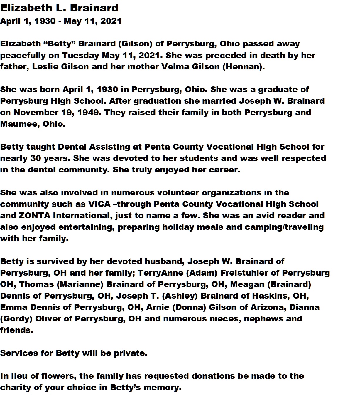 Brainard, Elizabeth - Obituary, Witzler Shank Walker Funeral Home, Perrysburg, OH