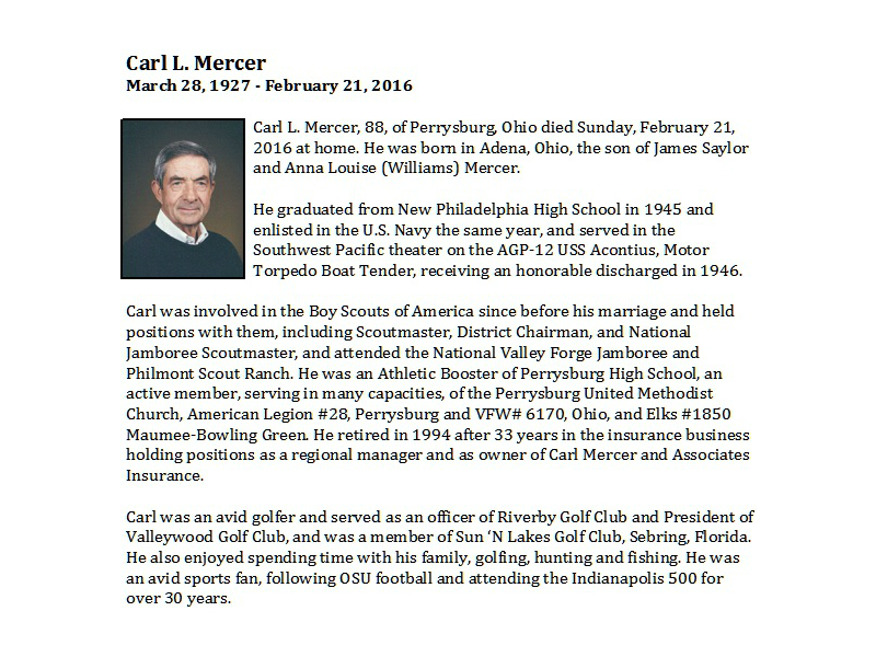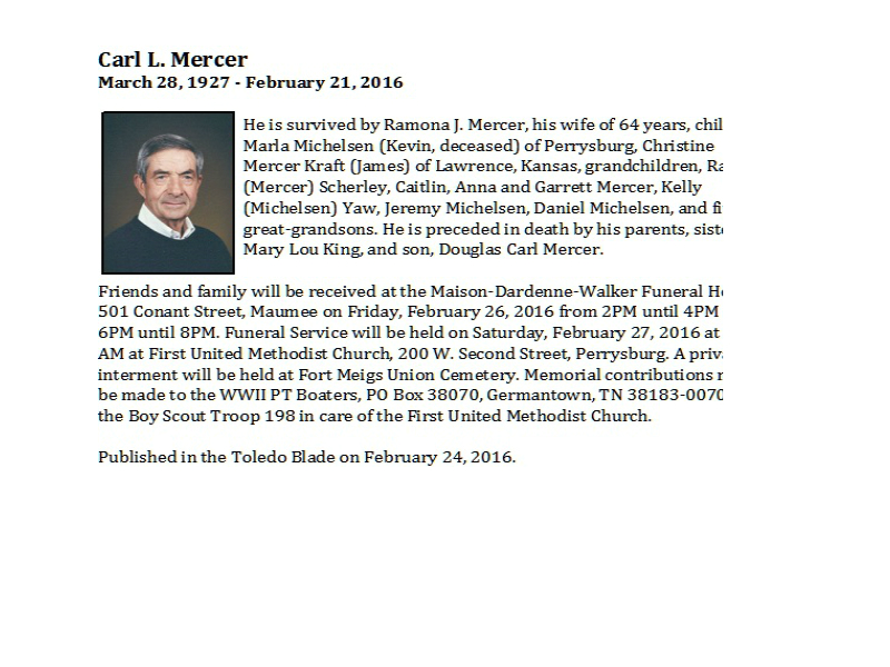 Mercer, Carl - Obituary pg 2, Maison-Dardenne-Walker Funeral Home, Maumee, OH Published in Toledo Blade; 02/24/2016