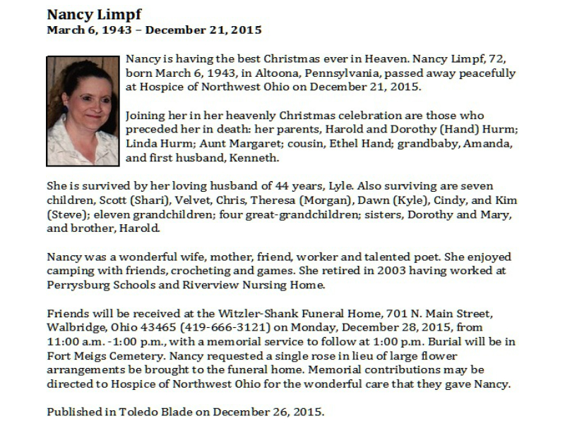 Limpf, Nancy, Witzler Shank Funeral Home, Perrysburg, OH Published in Toledo Blade; 12/26/2015