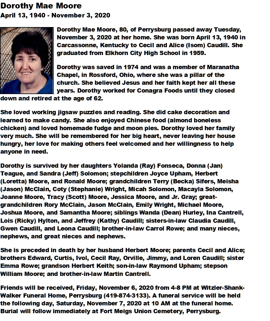 Moore, Dorothy - Obituary, Witzler Shank Walker Funeral Home, Perrysburg, OH