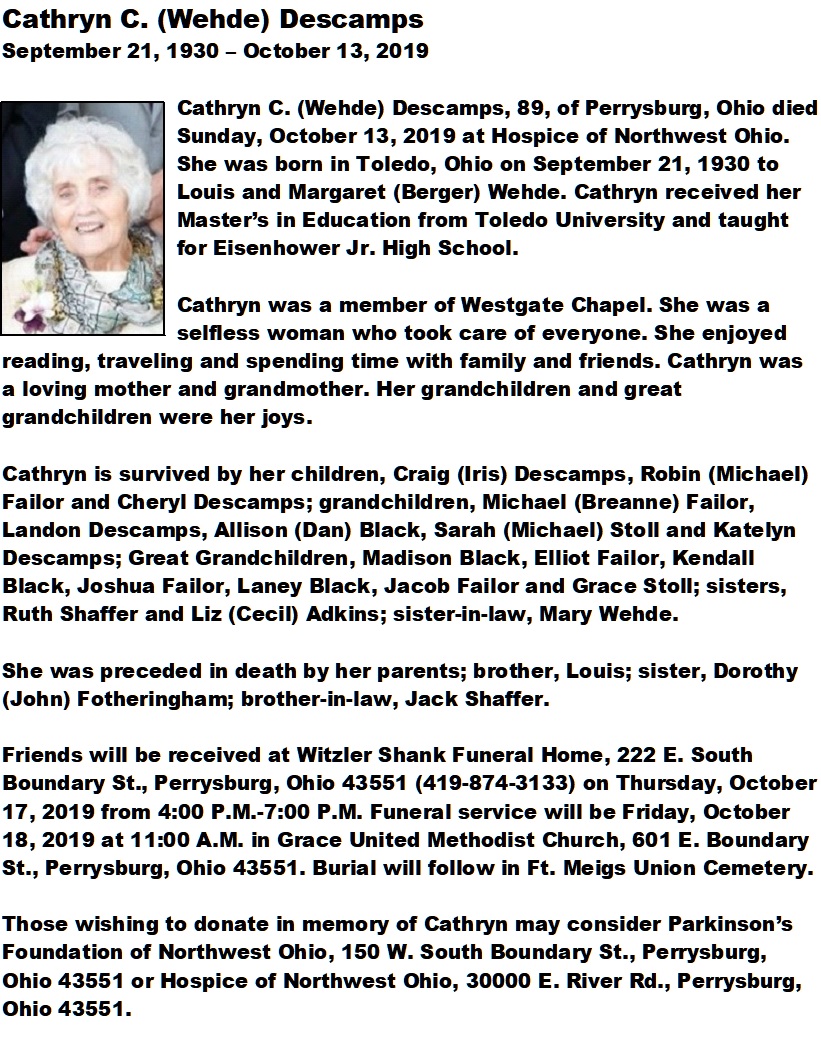 Descamps, Cathryn - Obituary, Witzler Shank Funeral Home, Perrysburg, OH