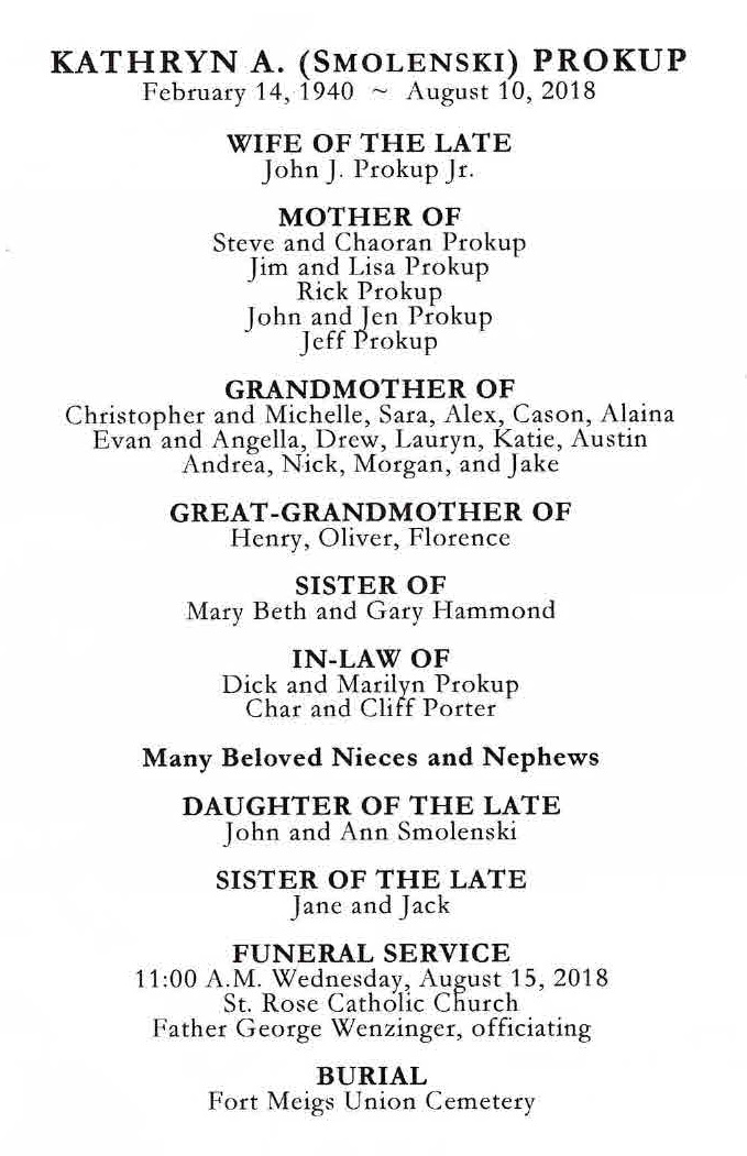 Prokup, Kathryn - Remembrance Card, Witzler Shank Funeral Home, Perrysburg, OH