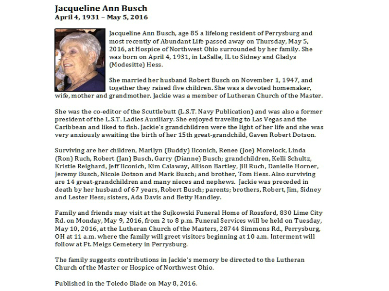 Busch, Jacqueline, Sujkowski Funeral Home, Rossford, OH Published in Toledo Blade; 05/08/2016