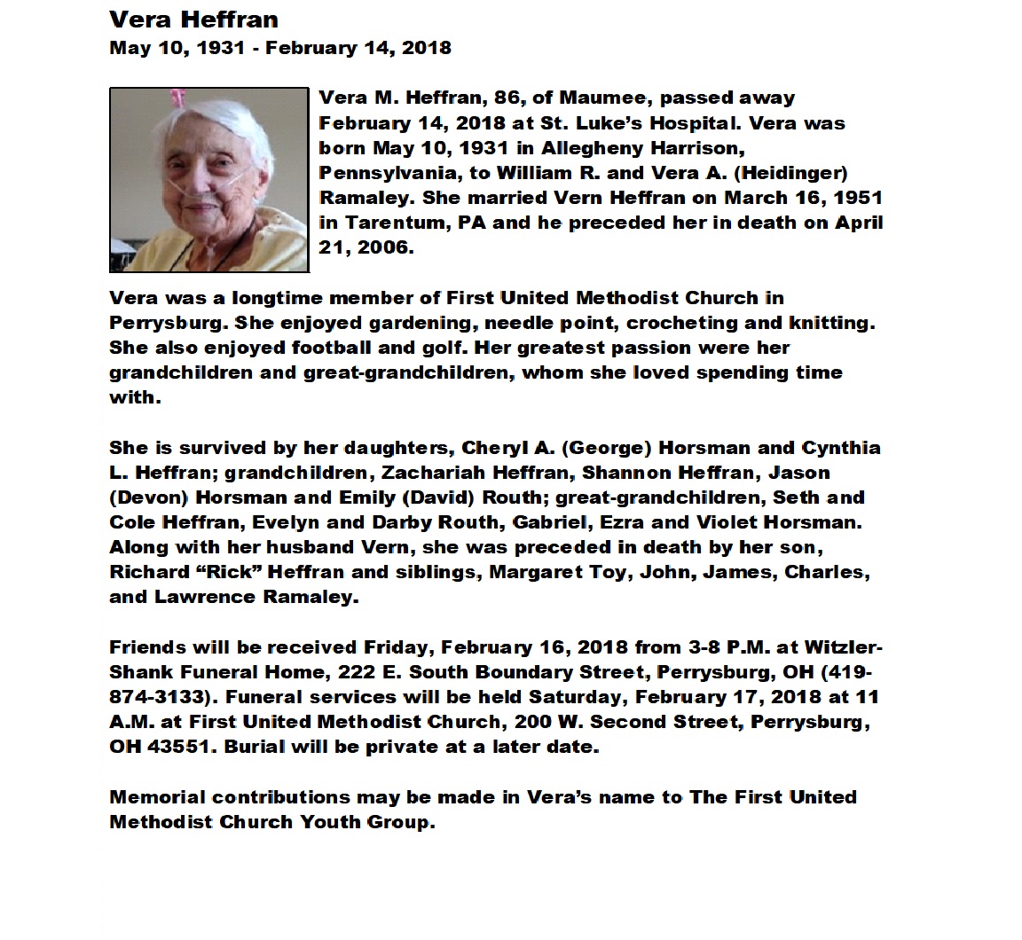 Heffran, Vera, Witzler Shank Funeral Home, Perrysburg, OH