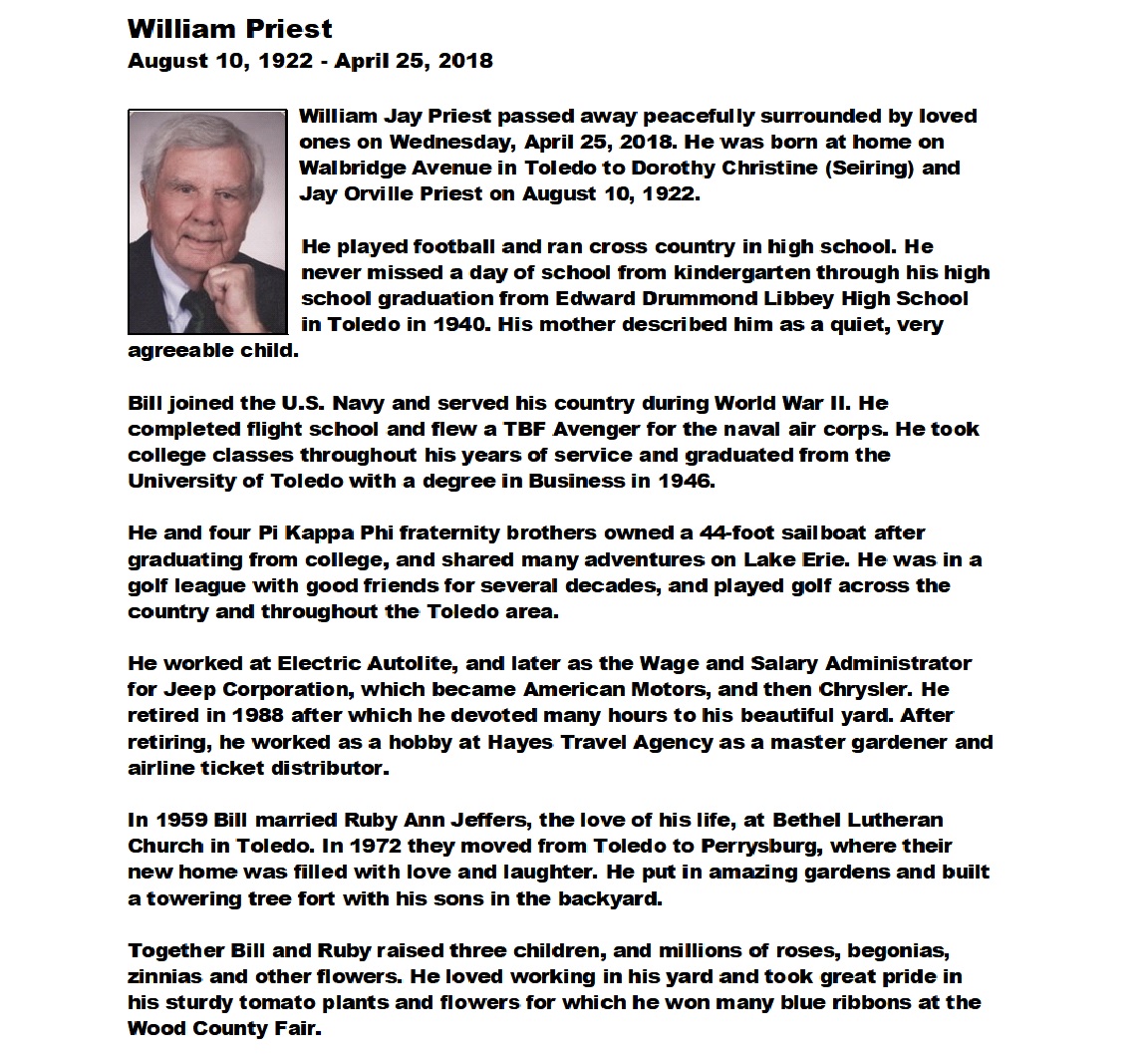 Priest, William J - Obituary pg 2, Witzler Shank Funeral Home, Perrysburg, OH