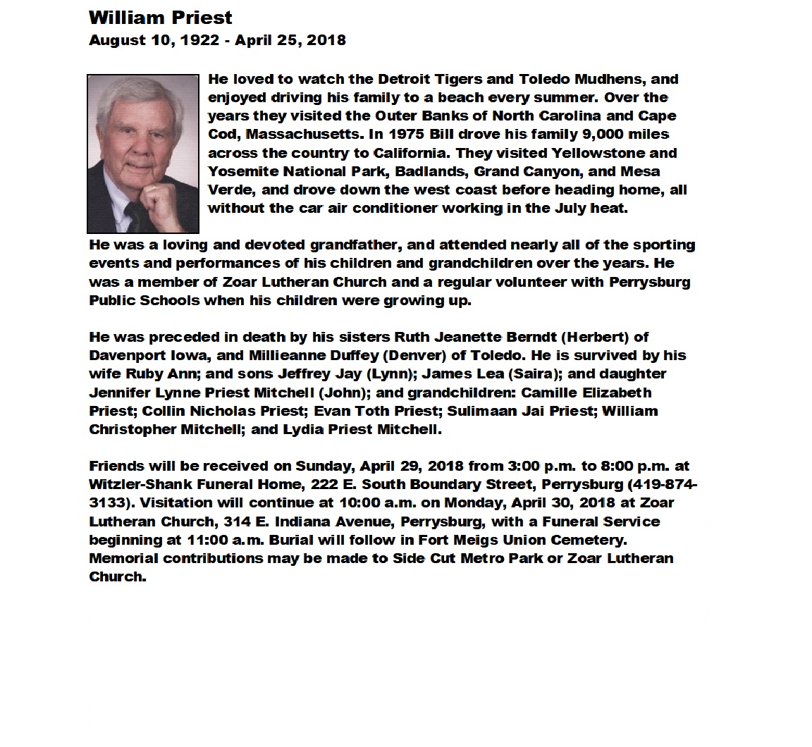 Priest, William J - Obituary pg 1, Witzler Shank Funeral Home, Perrysburg, OH