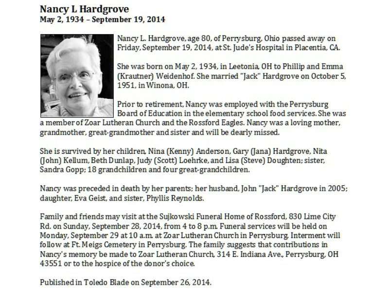Hardgrove, Nancy L, Sujkowski Funeral Home of Rossford