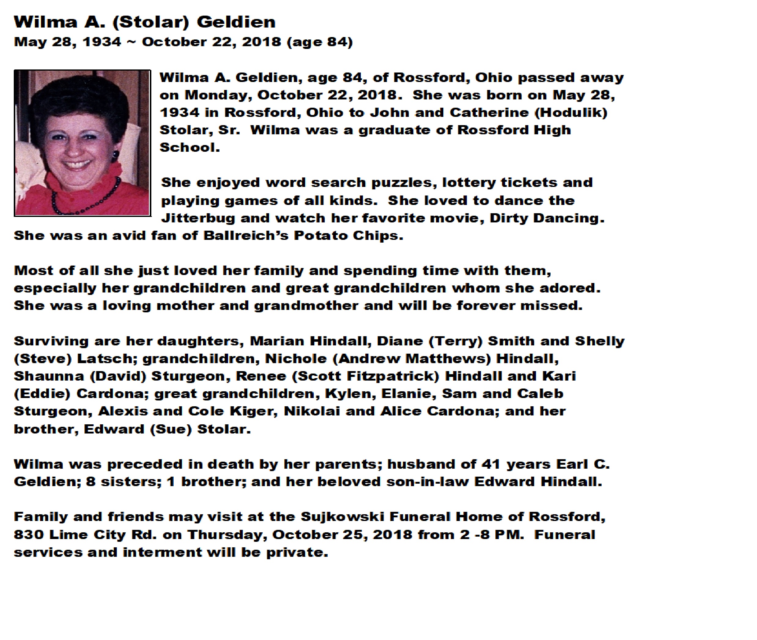 Geldien, Wilma, Sujkowski Funeral Home, Rossford, OH