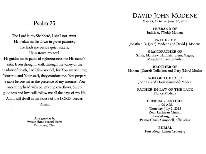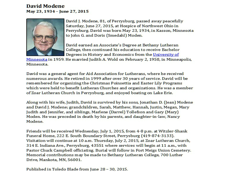 Modene, David, Witzler Shank Funeral Home, Perrysburg,OH Published in Toledo Blade; 6/28-30/2015