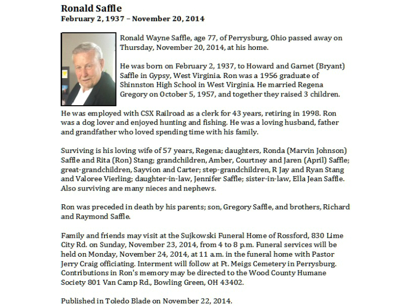 Saffle, Ronald, Sujkowski Funeral Home of Rossford