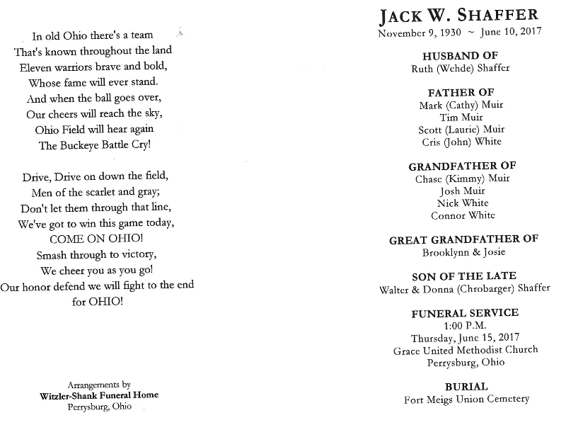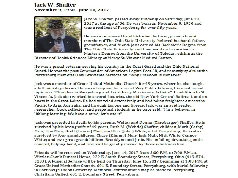 Shaffer, Jack - Obituary, Witzler Shank Funeral Home, Perrysburg, OH