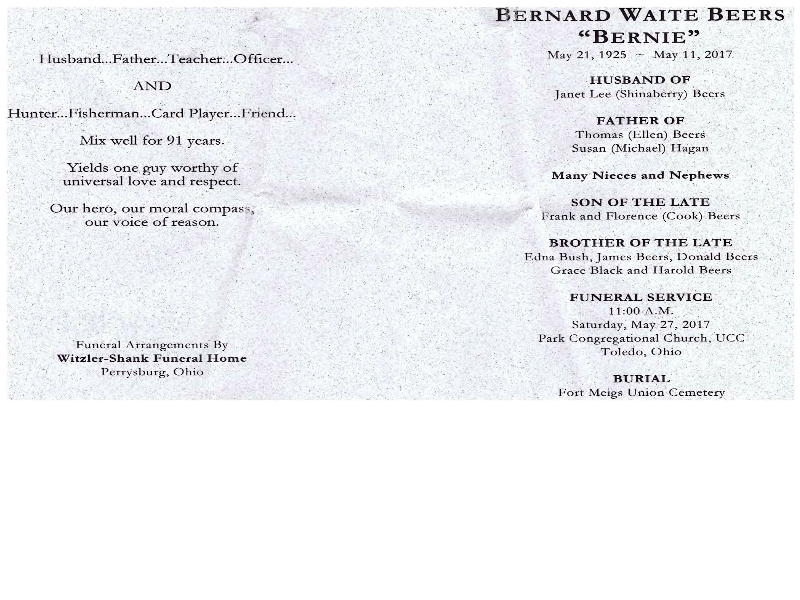 Beers, Bernard - Obituary, Witzler Shank Funeral Home, Perrysburg, OH