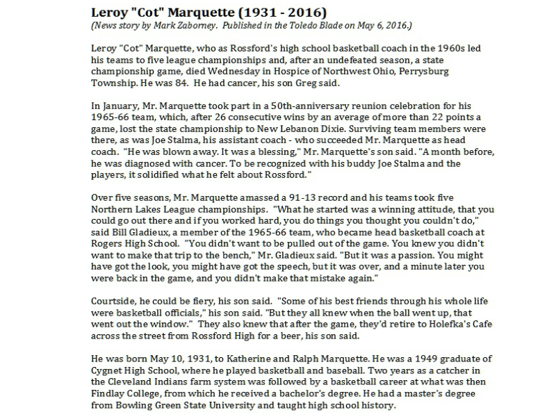 Marquette, Leroy - News Article - pg 1, Sujkowski Funeral Home, Rossford, OH Published in Toledo Blade; 05/06/2016