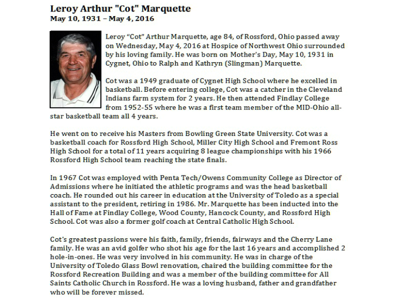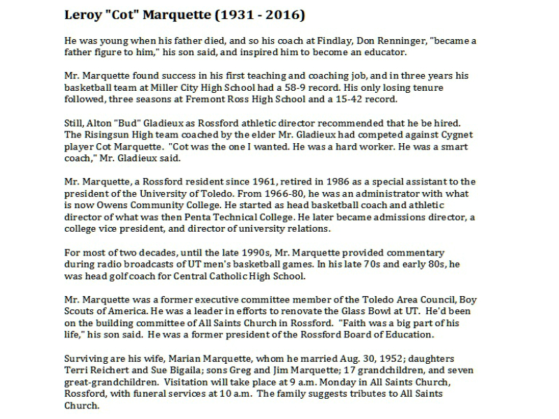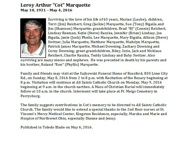 Marquette, Leroy - Obituary - pg 2, Sujkowski Funeral Home, Rossford, OH Published in Toledo Blade; 05/06/2016