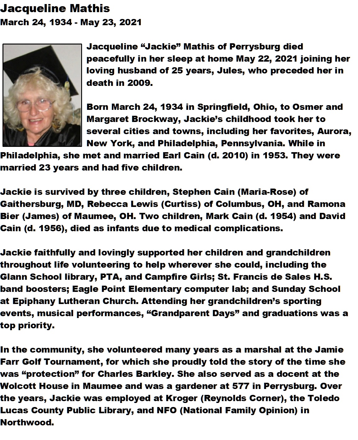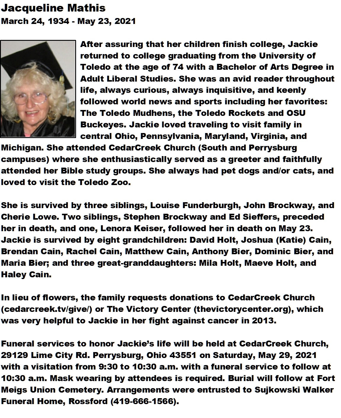 Mathis, Jacqueline - Obituary pg 1, Sujkowski Walker Funeral Home, Rossford, OH