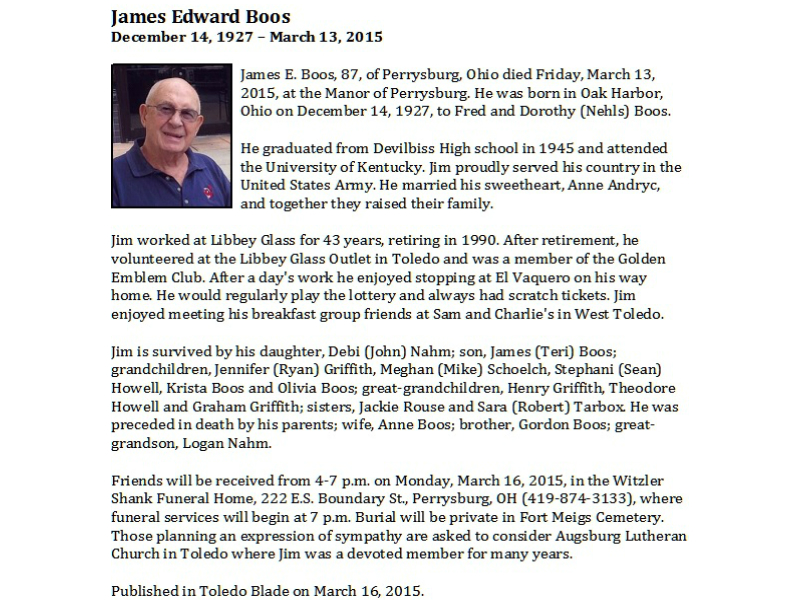 Boos, James, Witzler Shank Funeral Home, Perrysburg, OH Published in Toledo Blade; 03/16/2015