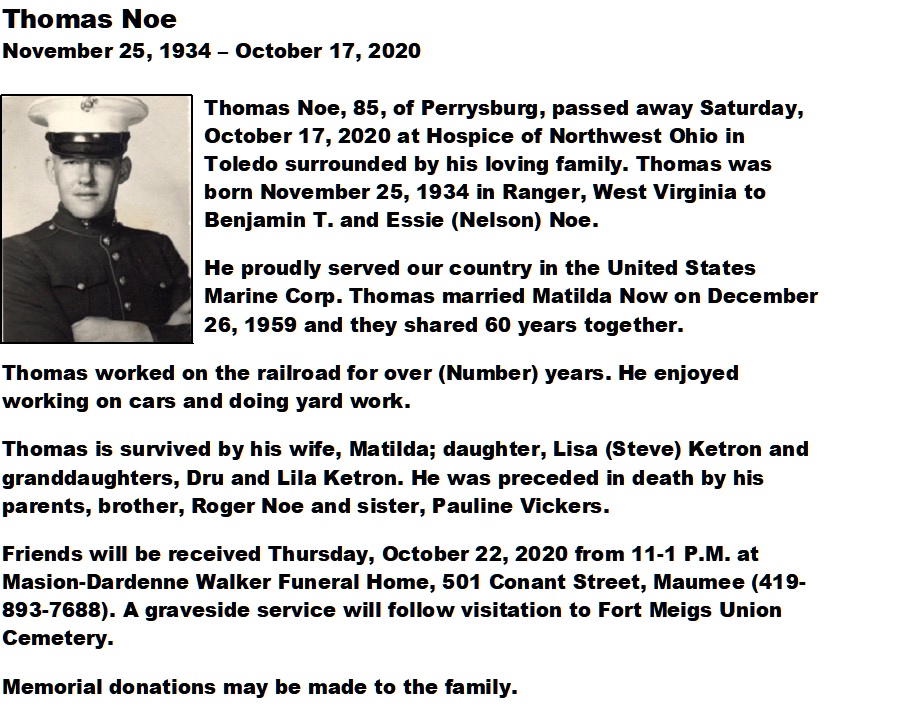 Noe, Thomas - Obituary, Maison-Dardenne-Walker Funeral Home, Maumee, OH
