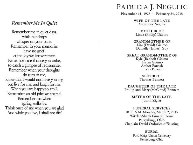 Negulic, Patricia - Remembrance Card, Witzler Shank Funeral Home, Perrysburg, OH