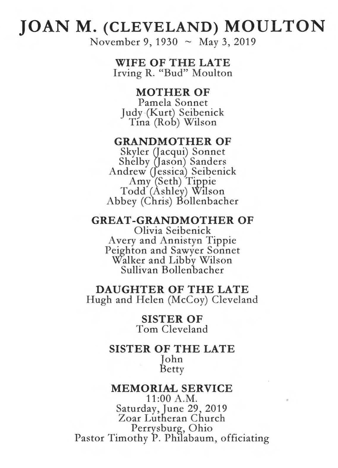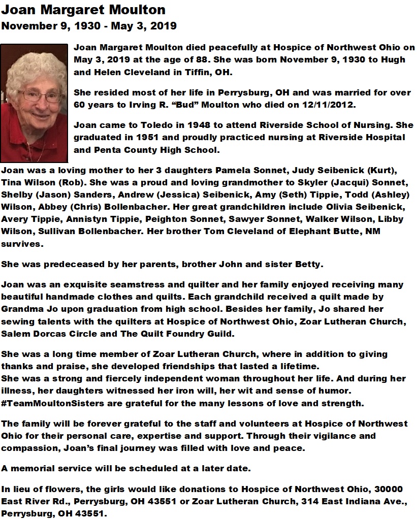 Moulton, Joan - Obituary, Witzler Shank Funeral Home, Perrysburg, OH