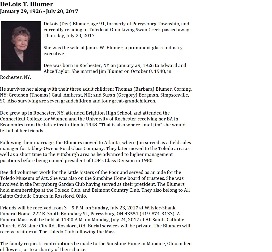 Blumer, DeLois - Obituary, Witzler Shank Funeral Home, Perrysburg, OH