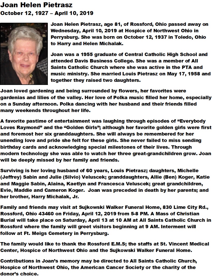 Pietrasz, Joan - Obituary, Sujkowski-Walker Funeral Home, Rossford, OH