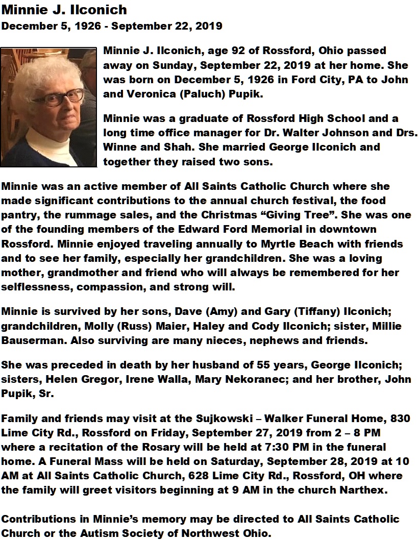 Ilconich, Minnie - Obituary, Sujkowski-Walker Funeral Home, Rossford, OH