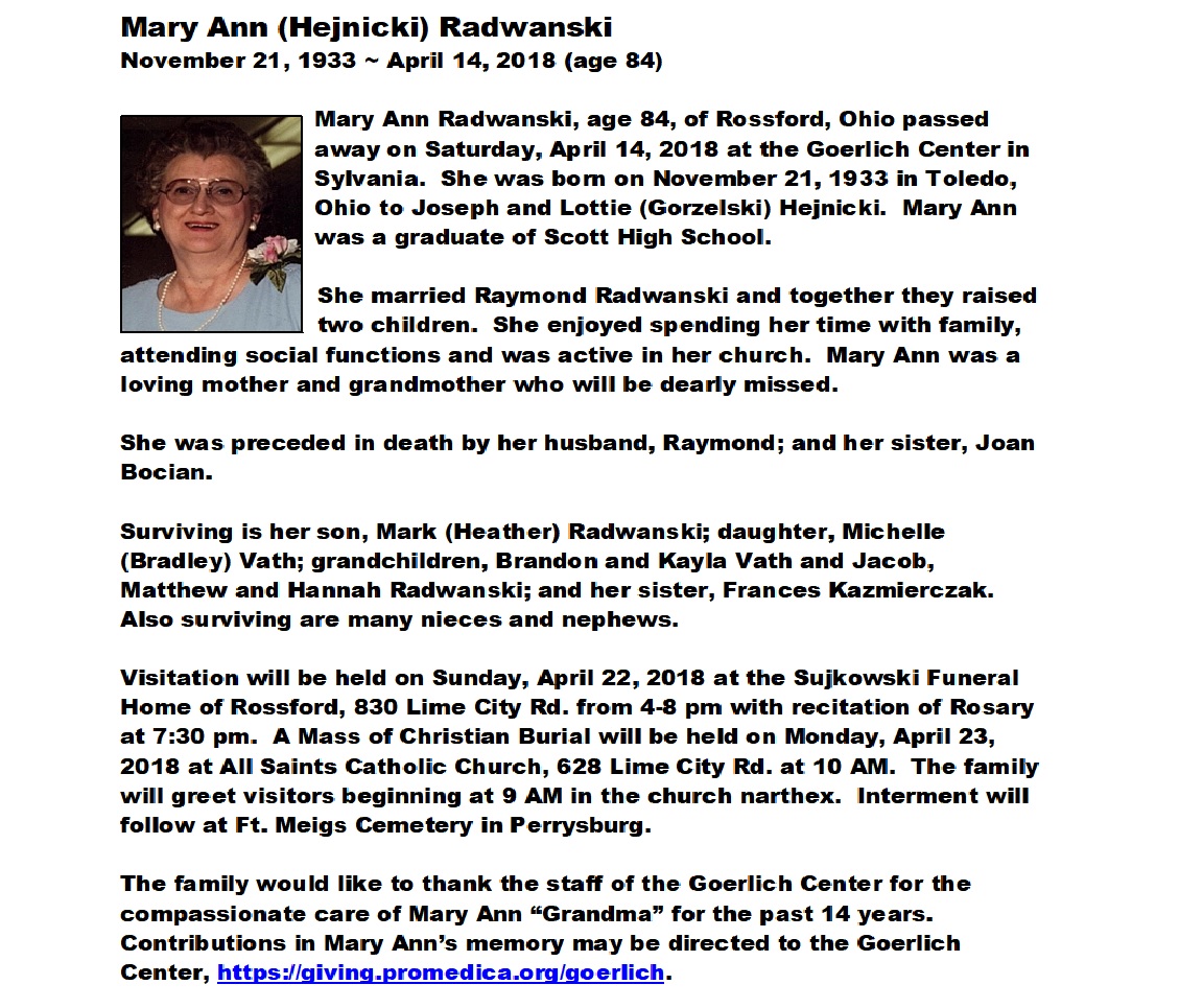 Radwanski, Mary Ann, Sujkowski Funeral Home, Rossford, OH