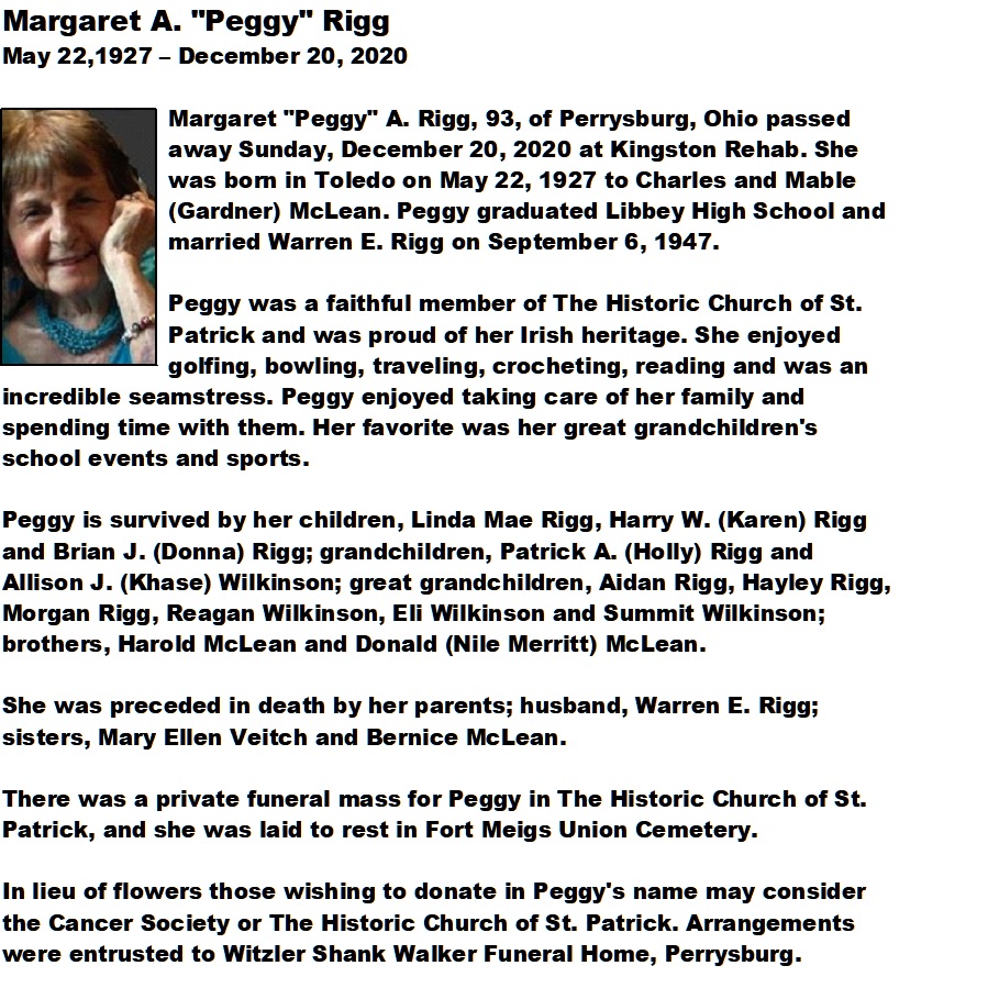 Rigg, Margaret - Obituary, Witzler Shank Walker Funeral Home, Perrysburg, OH