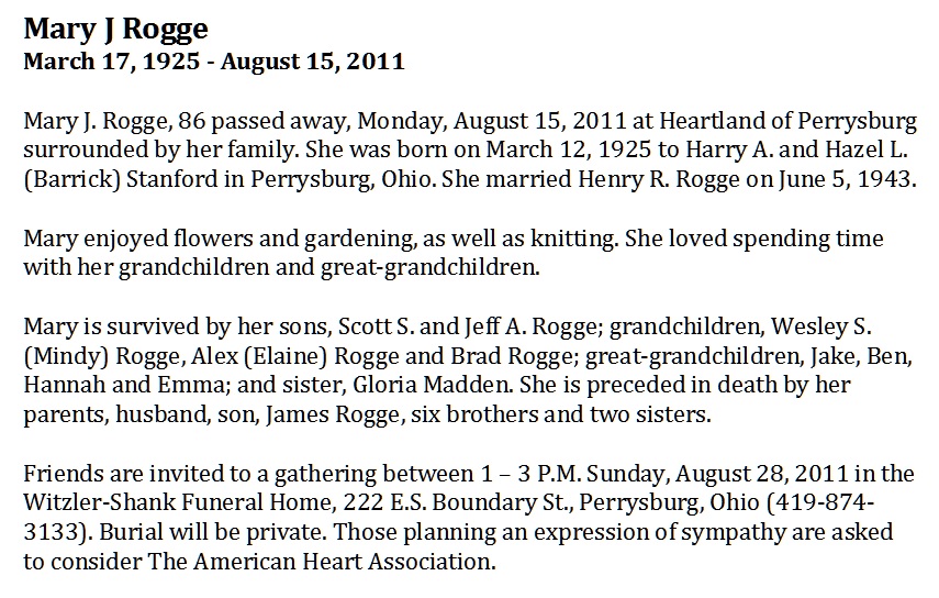 Rogge, Mary, Witzler Shank Funeral Home, Perrysburg, OH