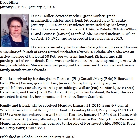 Miller, Dixie - Obituary, Witzler Shank Funeral Home, Perrysburg, OH Published in Toledo Blade; 01/09/2016