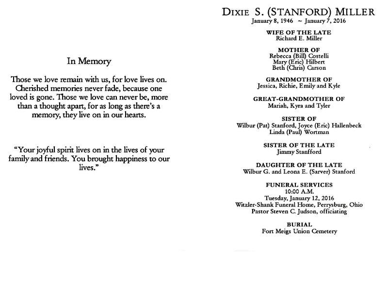 Miller, Dixie - Remembrance Card, Witzler Shank Funeral Home, Perrysburg, OH