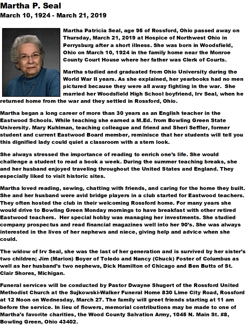 Seal, Martha P - Obituary, Sujkowski-Walker Funeral Home, Rossford, OH