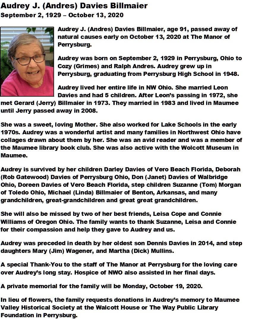 Billmaier-Davies, Audrey - Obituary, Maison-Dardenne-Walker Funeral Home, Maumee, OH