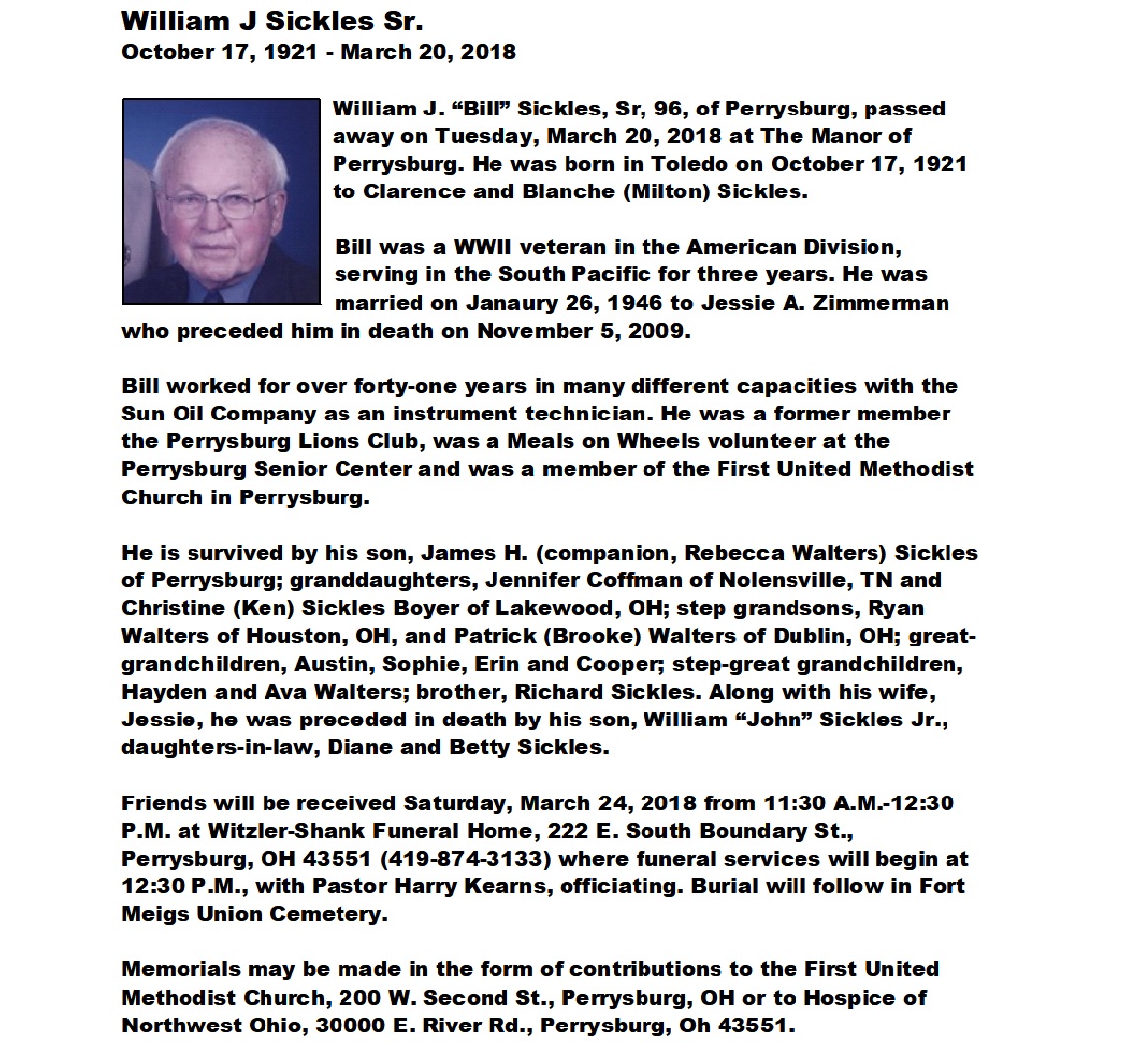 Sickles Sr, William - Obituary, Witzler Shank Funeral Home, Perrysburg, OH