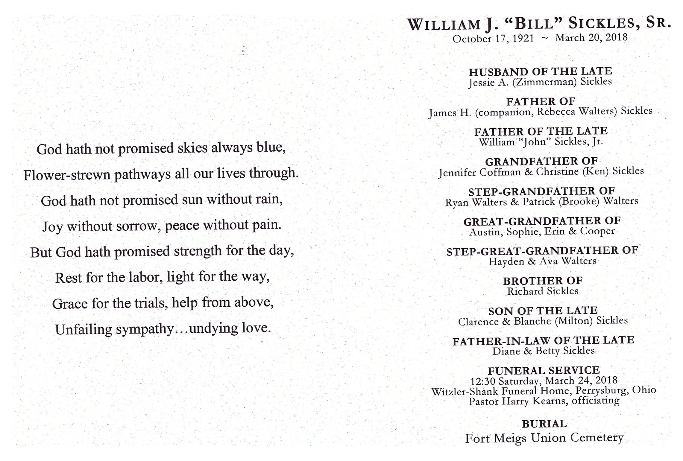 Sickles Sr, William - Remembrance Card, Witzler Shank Funeral Home, Perrysburg, OH